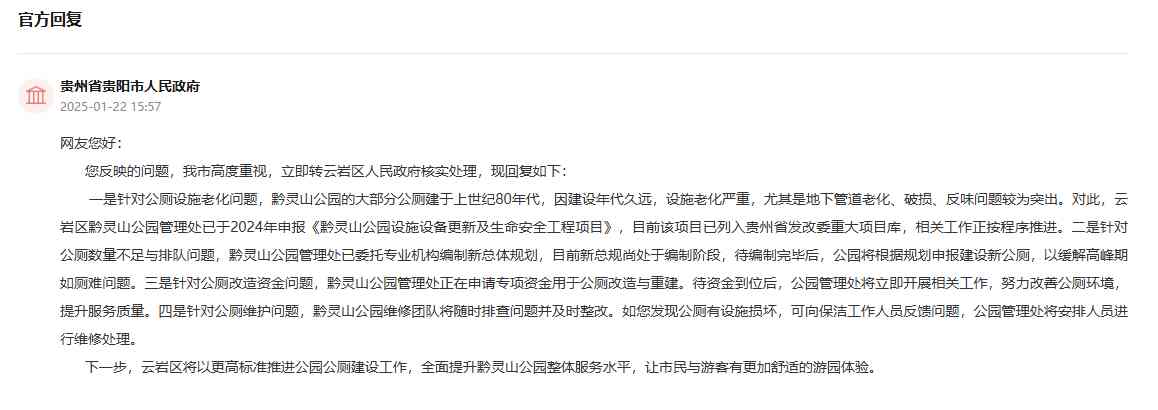 對于網友提出的公廁數量不足與排隊問題,黔靈山公園管理處已委托專業機構編制新總體規劃,目前新總規尚處于編制階段,待編制完畢后,公園將根據規劃申報建設新公廁,以緩解高峰期如廁難問題。
